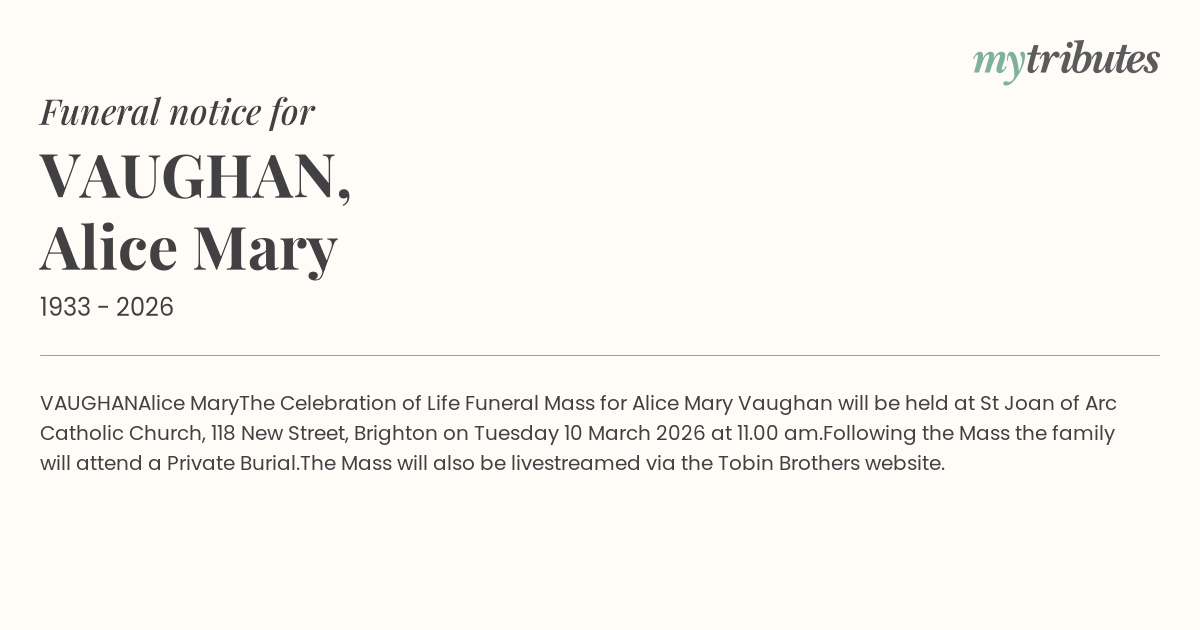 The Celebration of Life Funeral Mass for Alice Mary Vaughan will be held at St Joan of Arc Catholic Church, 118 New Street, Brighton on Tuesday 10 March 2026 at 11.00 am.