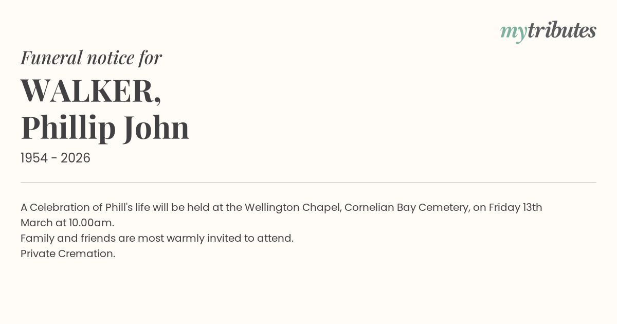 16°CA Celebration of Phill's life will be held at the Wellington Chapel, Cornelian Bay Cemetery, on Friday 13th March at 10.00am.