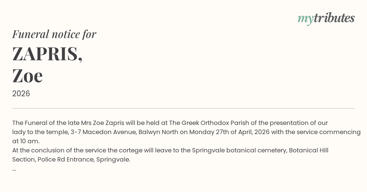 16°CThe Funeral of the late Mrs Zoe Zapris will be held at The Greek Orthodox Parish of the presentation of our lady to the temple, 3-7 Macedon Avenue, Balwyn North on Monday 27th of April, 2026 with the service commencing at 10 am.