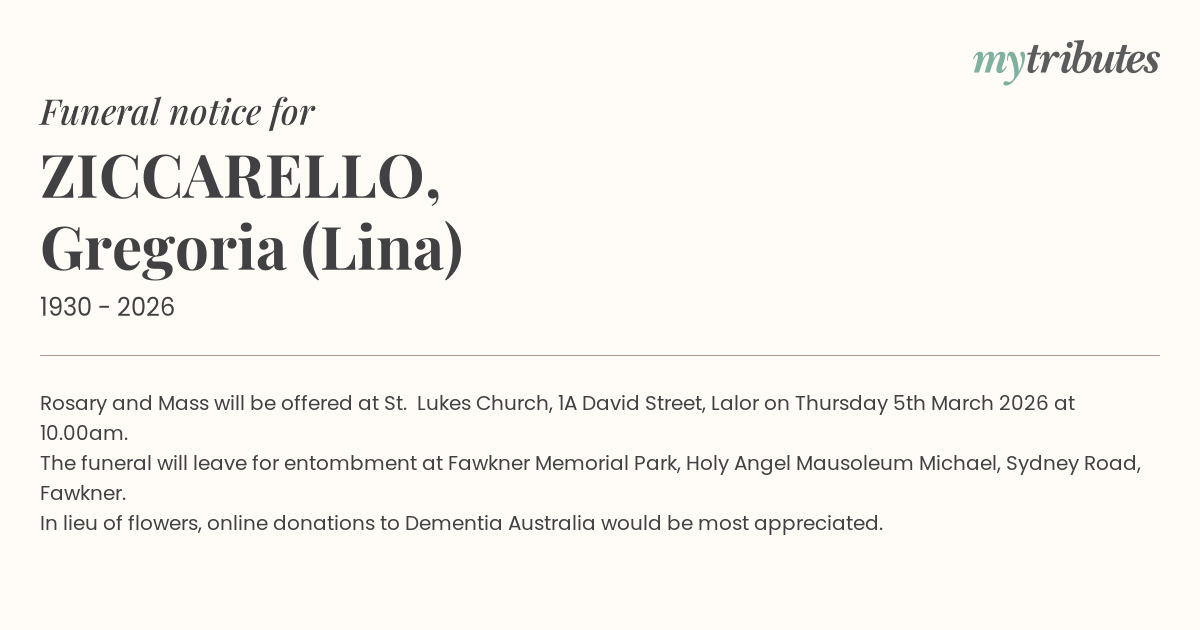 The funeral will leave for entombment at Fawkner Memorial Park, Holy Angel Mausoleum Michael, Sydney Road, Fawkner.